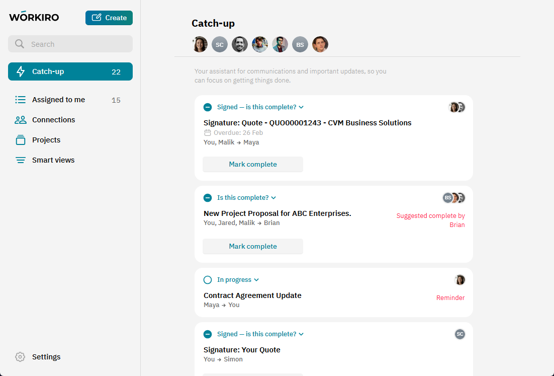 Workiro's 'Catch-up' is your super-handy assistant for communications and important updates, helping you stay focused on what matters most.